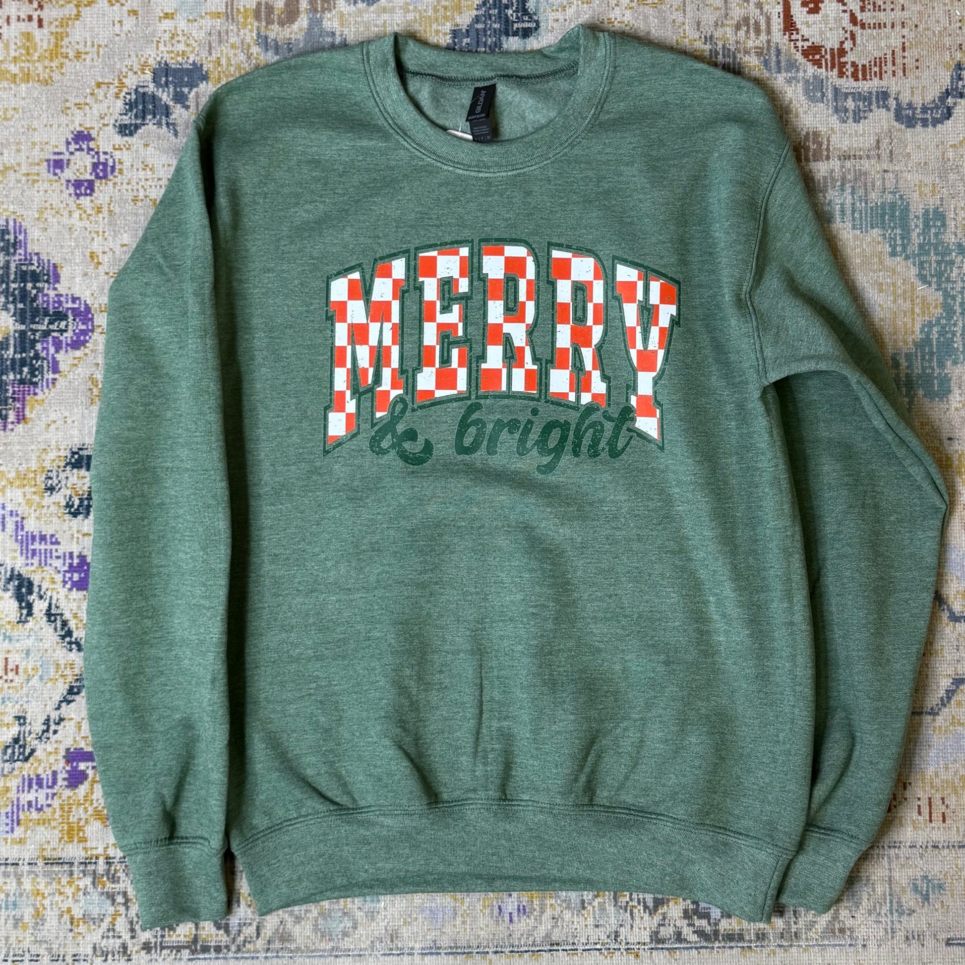 Checked Merry graphic on a Gildan crewneck